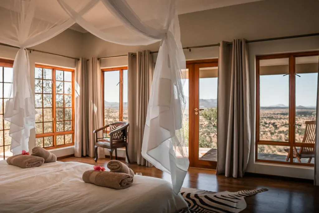 Auf Farm Haris und Farm Onduno wohnen Sie während Ihres Aufenthaltes in einem der gemütlichen und modernen Zimmer im Farmhausstil. Diese bieten Ihnen pure Entspannung mit einem Kingsize-Bett und En-Suite Badezimmer und privater Terrasse. Das große Farmhaus mit eigener Bar lädt zudem zum Entspannen ein.